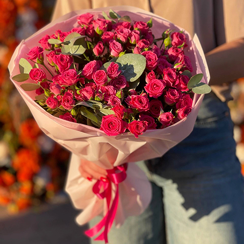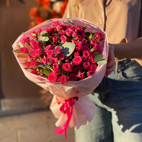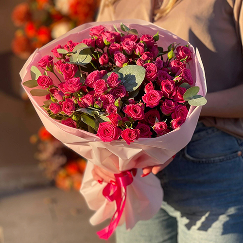 Букет из 15 кустовых малиновых роз и эвкалипта (40 см)